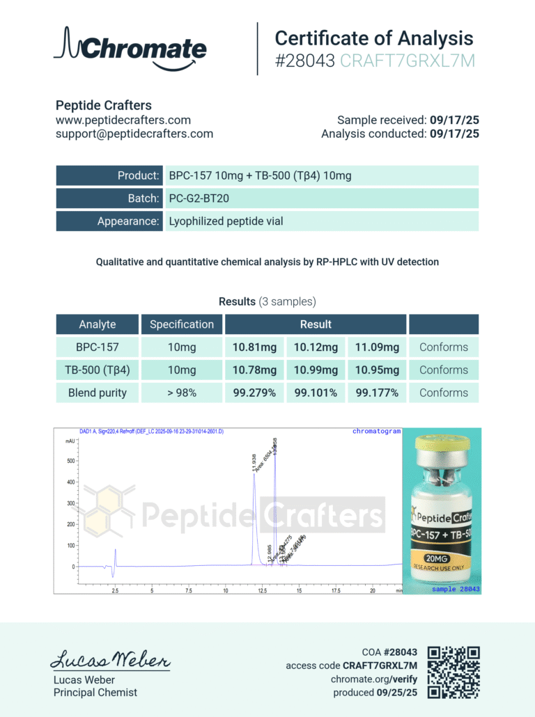 For laboratories seeking a high-quality, synergistic peptide combination, the BPC-157 & TB-500 20mg blend provides exceptional value. Its applications in tissue repair, wound healing, musculoskeletal recovery, and regenerative medicine make it a preferred choice for researchers aiming for precise, reproducible, and scientifically significant outcomes.