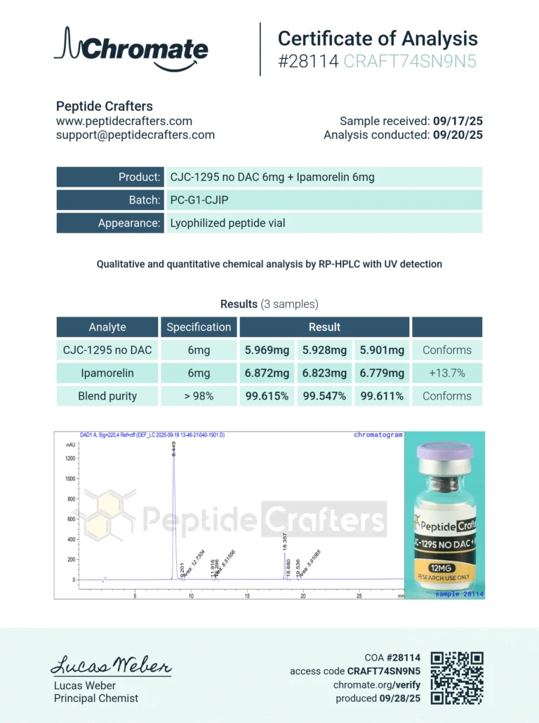 Each vial of CJC-1295 No DAC – Mod GRF (1-29) & Ipamorelin 12mg (6mg/6mg) Blend is manufactured under strict quality control standards to ensure high purity, long-term stability, and reproducibility. Supplied in lyophilized powder form, it allows for convenient storage, precise handling, and consistent experimental results. Proper laboratory storage—protected from heat, light, and moisture—is essential to maintain peptide integrity and research efficacy.