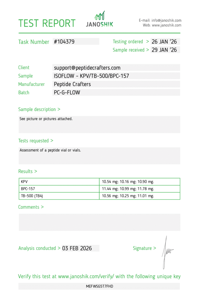 ISOFLOW 30mg Large 8mL Vial – KPV (10mg) + TB-500 (10mg) + BPC-157 (10mg) is a premium research peptide blend designed for advanced studies in tissue repair, inflammation modulation, and regenerative medicine. Formulated with high-purity peptides and lyophilized for stability, this blend ensures reproducibility, potency, and consistent results, making it an essential tool for laboratories investigating wound healing, cellular regeneration, and immune modulation. Its multi-peptide composition provides synergistic benefits, amplifying research potential across diverse experimental models.