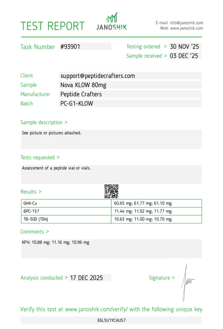 Each vial is supplied in lyophilized form to ensure maximum stability and long-term shelf life. When handled under proper laboratory conditions—protected from heat, light, and moisture—NOVA KLOW maintains its structural integrity and efficacy for reliable research results.