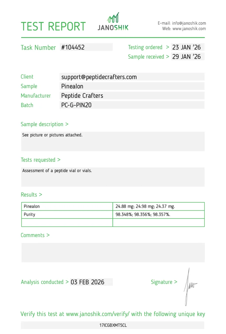 Each vial of Pinealon (25mg) is manufactured under strict quality control standards to ensure high purity, stability, and reproducibility. Supplied in lyophilized powder form, it allows for convenient storage and long-term shelf life when handled properly. Protecting the peptide from heat, light, and moisture is essential to maintain its structural integrity and effectiveness in research applications.