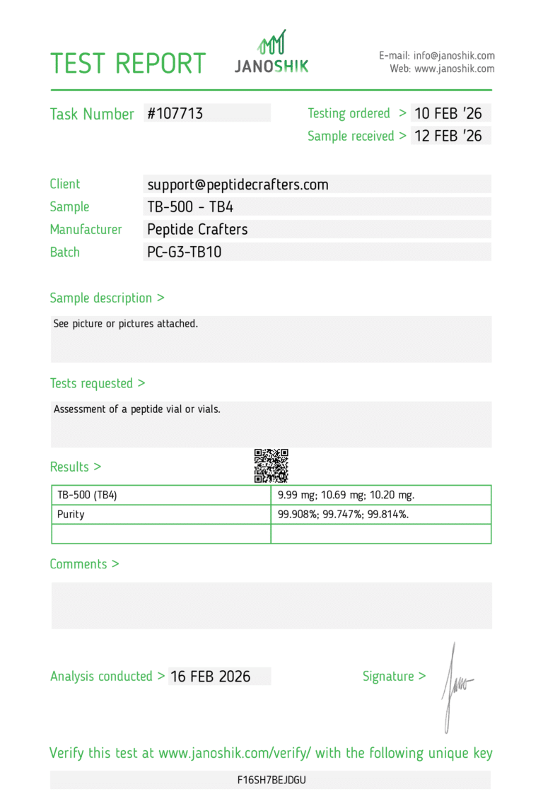 Each vial of TB-500 – Thymosin Beta-4 (10mg) is produced under strict quality control standards to ensure high purity and reliability. Supplied in lyophilized powder form, it allows for convenient storage and long-term stability when handled correctly. Proper storage conditions, including protection from heat, light, and moisture, are essential to maintain its structural integrity and effectiveness in research applications.